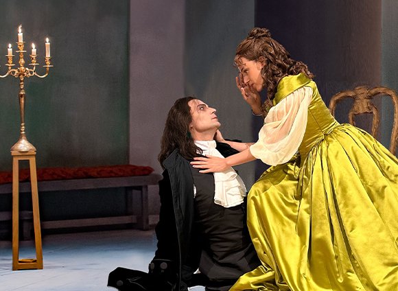 Protagonista è Fausto Cabra, un Alceste, qui in costume, scuro, al centro di un mondo popolato da personaggi vestiti nella stessa foggia, ma in colori pastello diversi tra loro, a simboleggiare una società variegata nella forma, omologata però nella sostanza. Accanto a lui una straordinaria compagnia.